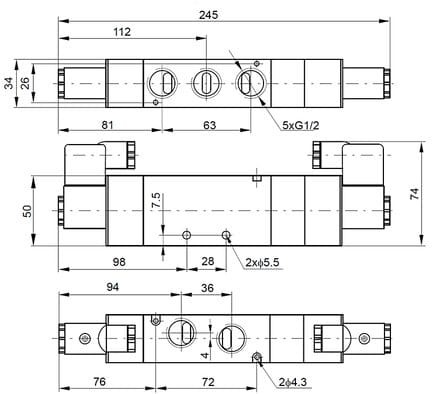 Urządzenia te wyposażone są w dwa elektromagnesy i sprężynę centrującą, która ustawia zawór w pozycji środkowej w stanie beznapięciowym. Elektrozawory tej serii mogą być montowane zarówno bezpośrednio na przewodach, jak i na płytach zaworowych. Napięcie sterowania dobierane jest indywidualnie w wariantach produktu. W kanałach odpowietrzających (3 i 5) zaleca się stosowanie tłumików hałasu, co pozwala ograniczyć hałas układu pneumatycznego.