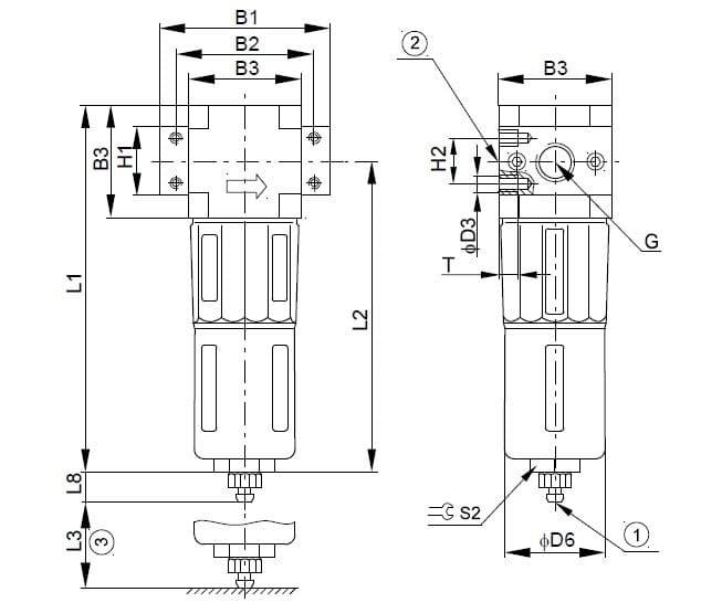 Filtr z przyłączem G1/4 do oczyszczania sprężonego powietrza z zanieczyszczeń mechanicznych i kondensatu. Standardowy wkład filtrujący o dokładności 5 μm umożliwia efektywną ochronę podzespołów układu pneumatycznego.