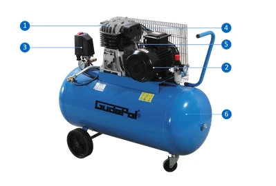 Sprężarka GD 38-150-395-3F – Sprężarka tłokowa z napędem pasowym, przeznaczona do pracy przy ciśnieniu do 10 bar. Wyposażona w silnik trójfazowy 400 V i zbiornik o pojemności 150 litrów.