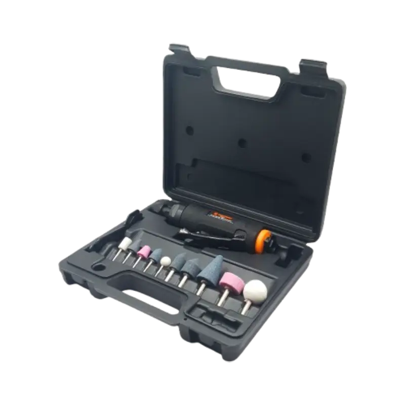 Szlifierka trzpieniowa – Pneumatyczna szlifierka trzpieniowa z uchwytem na trzpienie o średnicy 6 mm, przeznaczona do precyzyjnych prac warsztatowych. Dostarczana w zestawie z kamieniami korundowymi oraz tuleją zaciskową 3 mm.