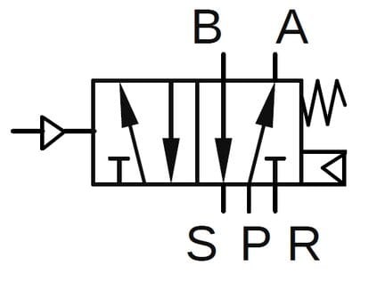 Zawór pneumatyczny 5/2 G1/4″ przeznaczony jest do sterowania siłownikami pneumatycznymi dwustronnego działania. Wersja monostabilna działa poprzez impuls ciśnienia sterującego, a powrót do pozycji początkowej realizowany jest przy pomocy sprężonego powietrza wspomaganego sprężyną.