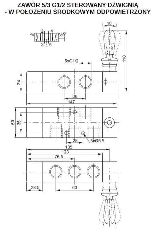Zawór ręczny z dźwignią 5/3 G1/2 w poł. środkowym odcięty, centrowany sprężynami