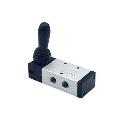 Ręczny zawór 5-drogowy, 3-położeniowy stosowany do sterowania kierunkiem przepływu sprężonego powietrza. W pozycji środkowej wszystkie drogi są odcięte, co pozwala na bezpieczne zatrzymanie siłowników bez rozprężania medium. Dźwignia po przestawieniu wraca samoczynnie do pozycji środkowej dzięki sprężynom centrującym.