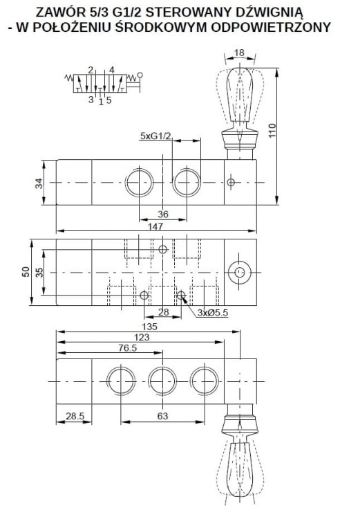 Zawór ręczny z dźwignią 5/3 G1/2 odpowietrzany, centrowany sprężynami