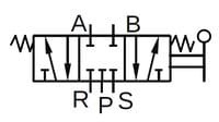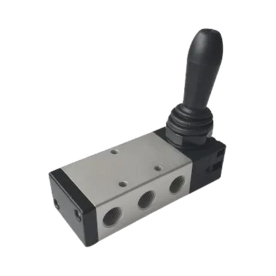 Ręczny zawór 5-drogowy, 3-położeniowy stosowany do sterowania kierunkiem przepływu sprężonego powietrza. W pozycji środkowej wszystkie drogi są odcięte, co pozwala na bezpieczne zatrzymanie siłowników bez rozprężania medium. Dźwignia po przestawieniu wraca samoczynnie do pozycji środkowej dzięki sprężynom centrującym.