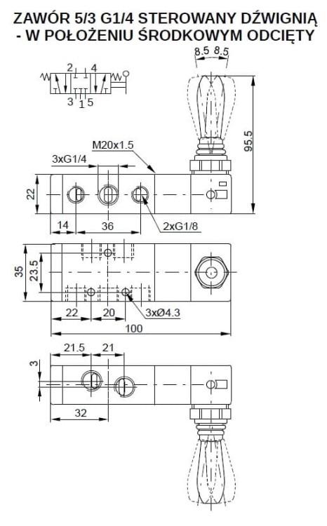 Zawór ręczny z dźwignią 5/3 G1/4 w położeniu środkowym odcięty, centrowany sprężynami