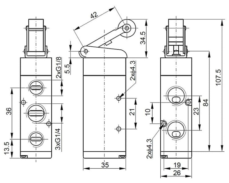 Zawór sterowany dźwignią z rolką 5/2 G1/4 – Mechaniczny zawór 5-drogowy, 2-położeniowy przeznaczony do bezpośredniego sterowania sprężonym powietrzem w układach automatyki. Obsługiwany przez ruch elementu mechanicznego, z samopowrotem do pozycji wyjściowej dzięki sprężynie.