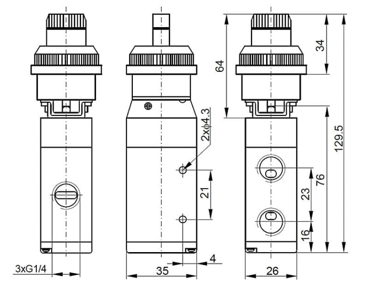 Zawór 3-drogowy, 2-położeniowy przeznaczony do ręcznego sterowania przepływem powietrza w układach pneumatycznych. Obsługa odbywa się przez przekręcenie przełącznika pokrętnego, który mechanicznie ustawia zawór w położeniu przesterowanym. Zawór pozostaje w wybranej pozycji do momentu kolejnego przestawienia przełącznika.