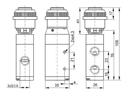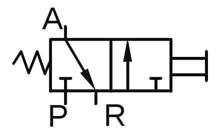 Zawór 3-drogowy, 2-położeniowy z przyciskiem krytym przeznaczony do ręcznego sterowania przepływem sprężonego powietrza. Przesterowanie następuje po naciśnięciu przycisku. Po jego zwolnieniu zawór powraca do pozycji początkowej dzięki sprężynie.